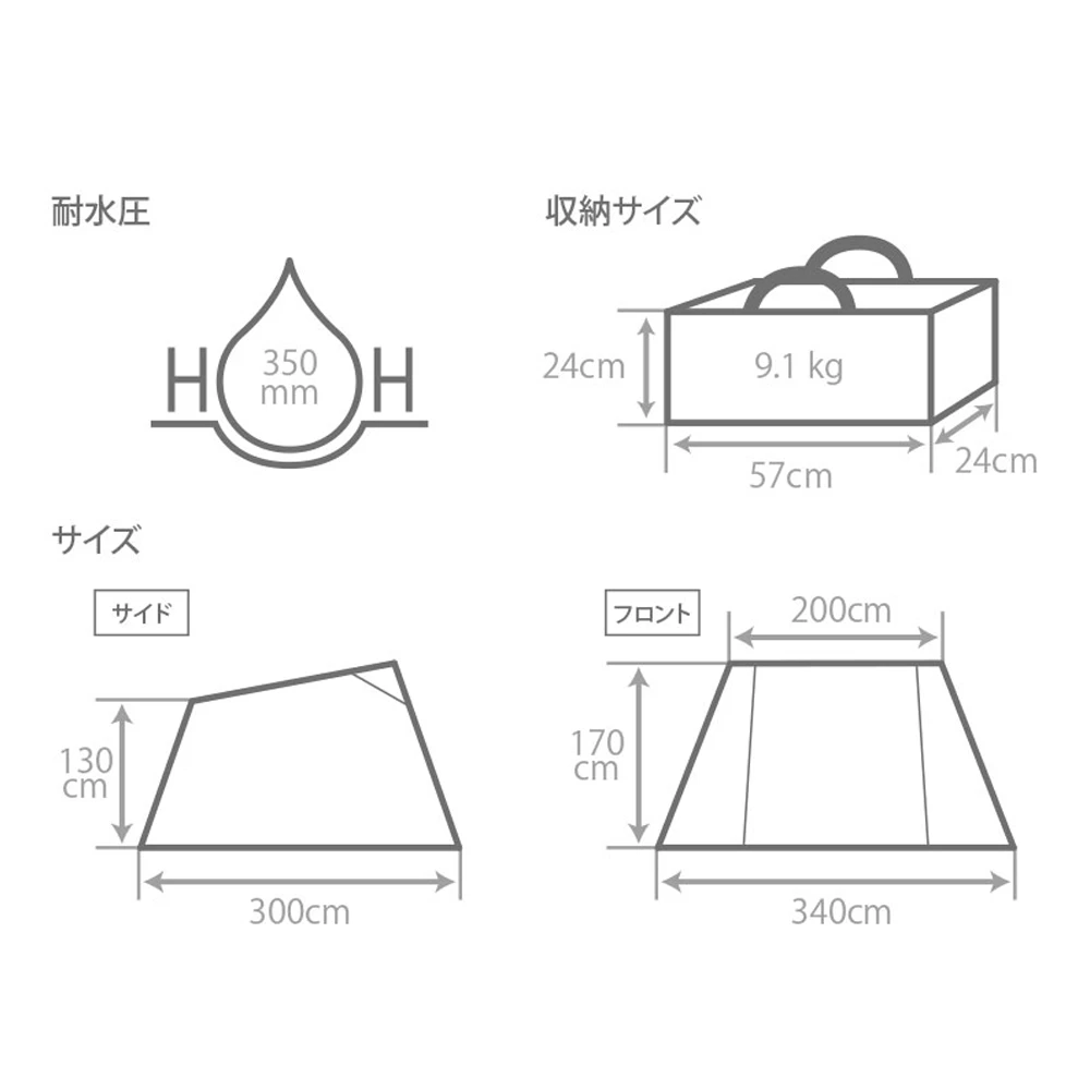 - Set Content: Tent fabric, pole (long) x 2, pole (short) x 2, rope x 5, compression belt, peg x 15, carry bag