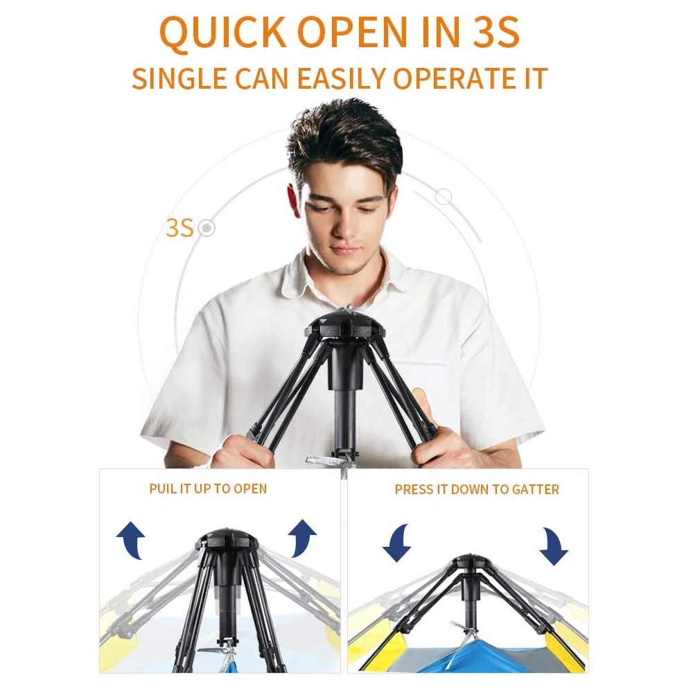 - Easy to Set-up and Fold-Down: Lay out the tent, lift up the top of the tent after spreading 4 arms and it will automatic installation in 3 seconds. Take down: Press down on the short struts and please apply force there, the tent will fold inwards and be in a state to pack away.