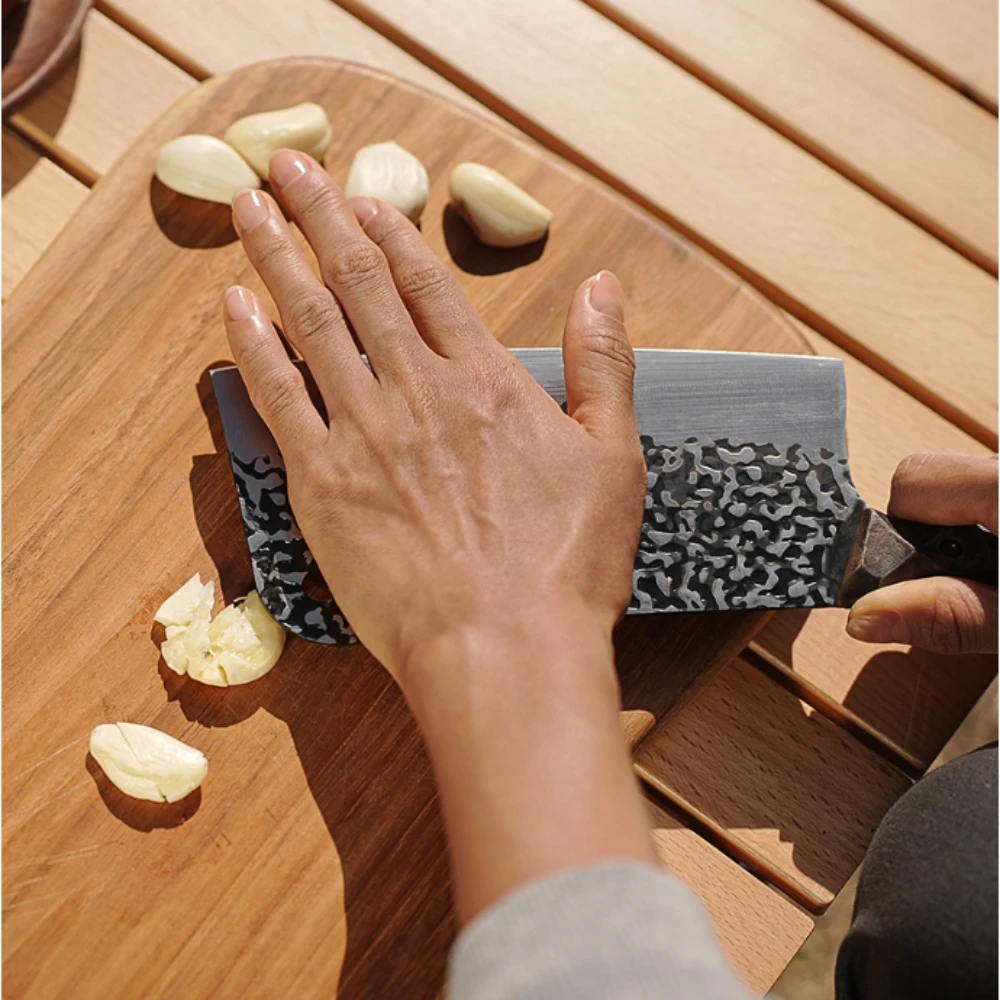 It is a Chinese cutlery that can easily handle various food materials with an emotional design and excellent cutting power.ย Leather fabric is applied to the case, and suede fabric is applied to the lining to further protect the cleaver.ย In addition, the wood handle using walnut wood is light and has strong durability, so it is not sensitive to temperature changes, so it can be used for a long time without deformation.