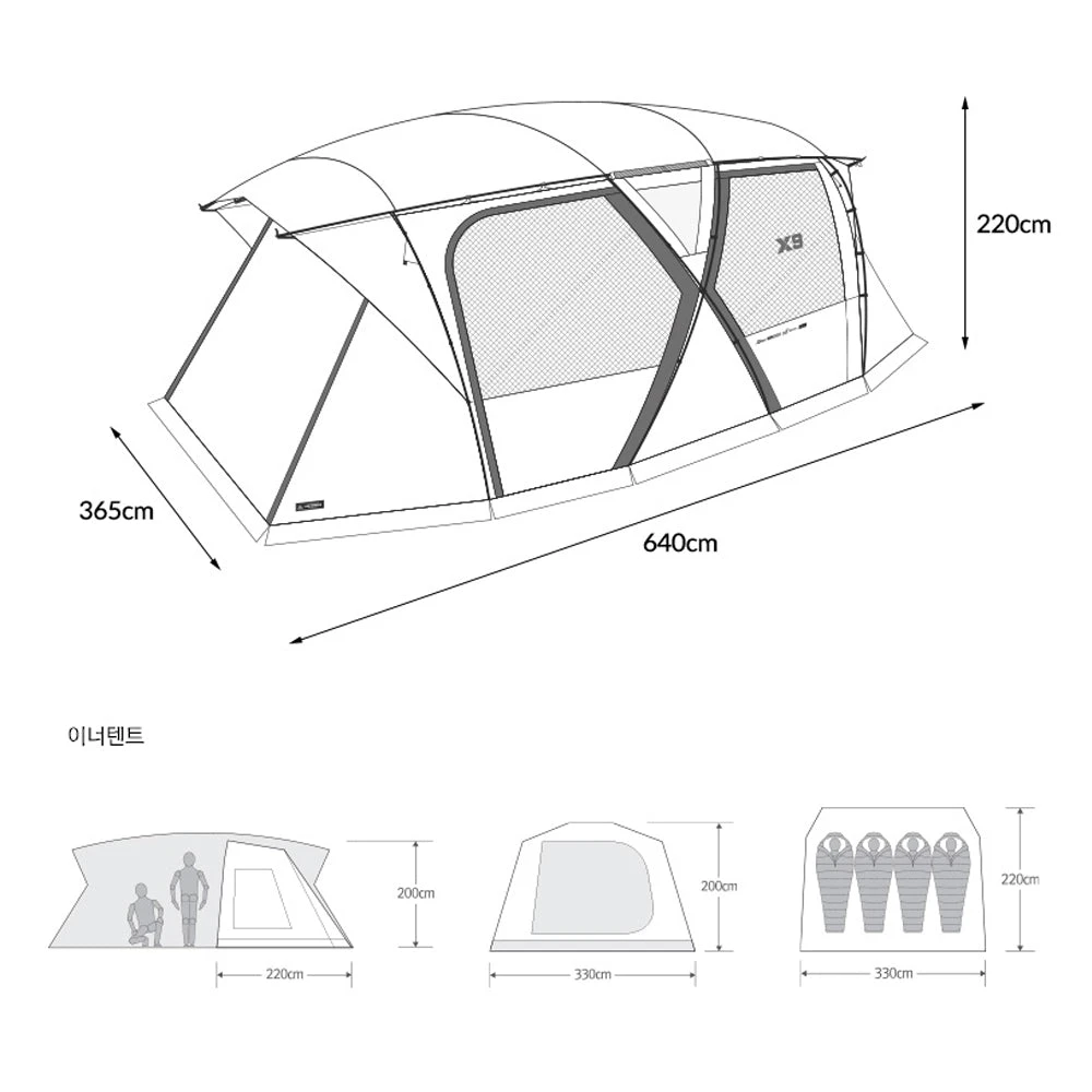 - Dimension: ย Upon installation – 640 x 365(H) x 220 CM | Storage – 80 x 35(H) x 35 CM | Inner tent – 330 x 220 x 200 (H) CM