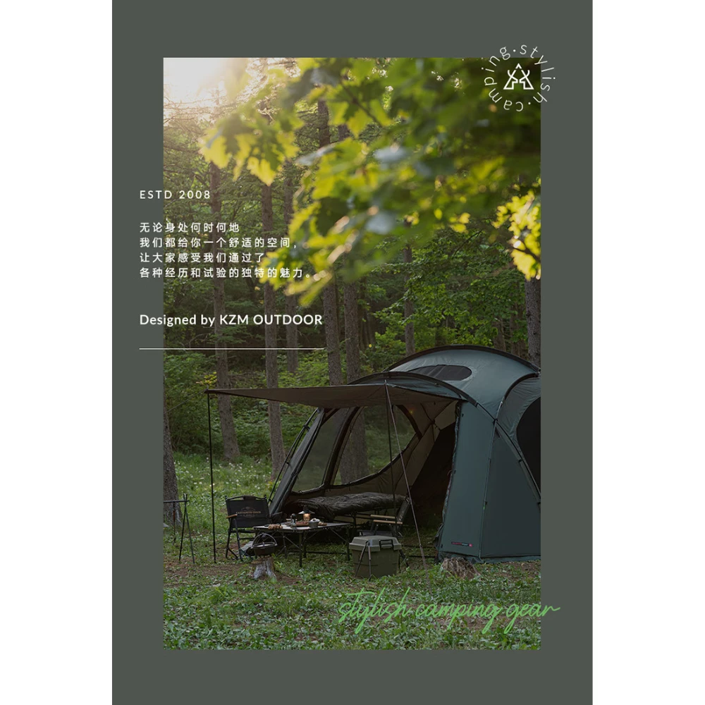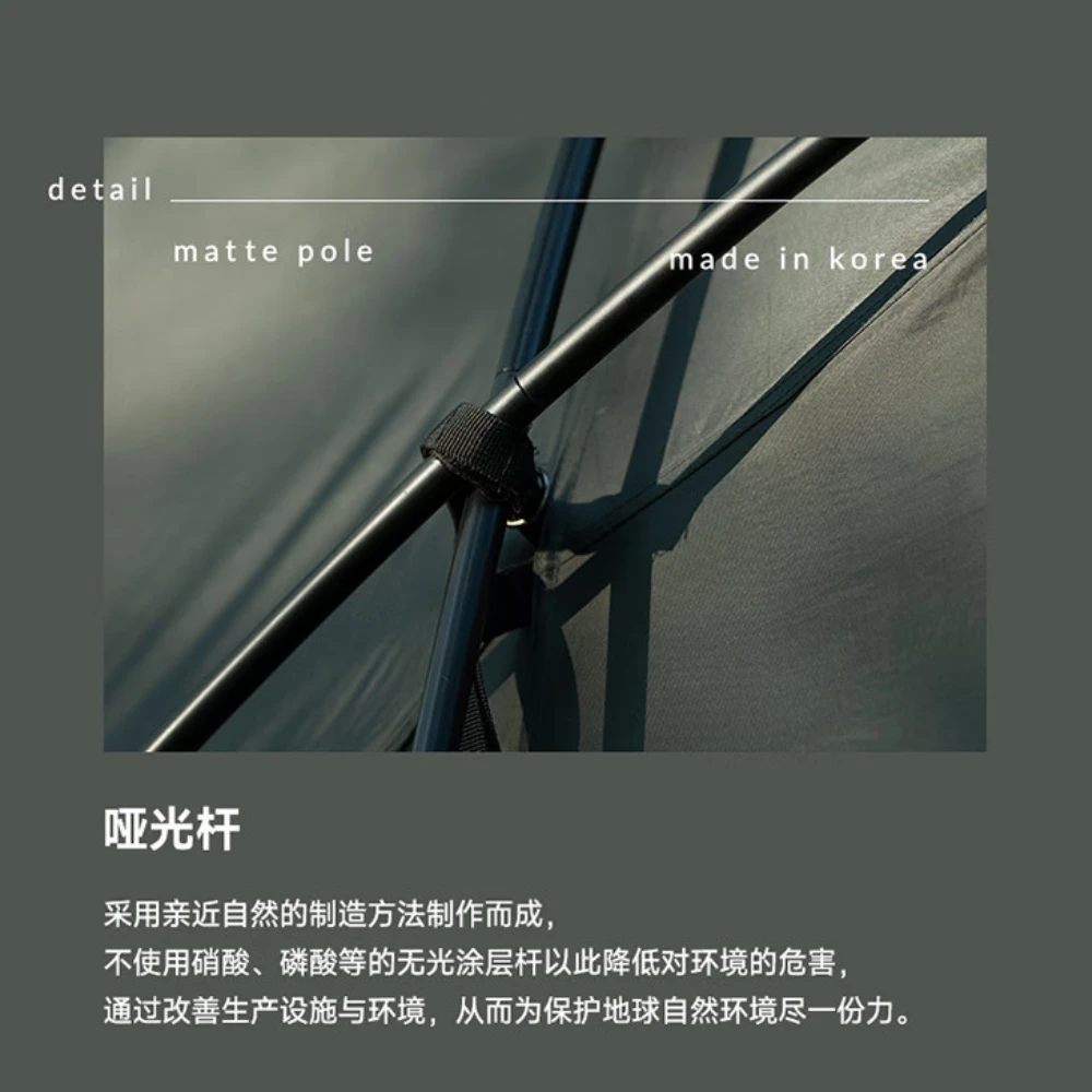 This is a new living shell tent with a unique design and a spacious and comfortable living space.ย It provides a spacious front room with a width of 440cm and a height of 215cm, and it is possible to stand strong with the side poles.ย The zerolux system for a comfortable night’s sleep is applied to the inner tent, and it provides a good space for 4-5 people.ย The rear canopy and black pigment-coated roof provide a comfortable living space.ย A side screen is applied for a private camping life.