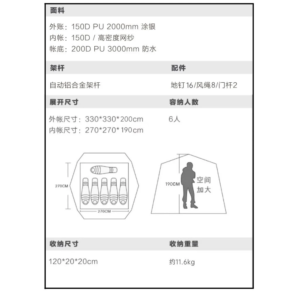 Outer Tent Size: 330 cm x 330 cm x 200 cm